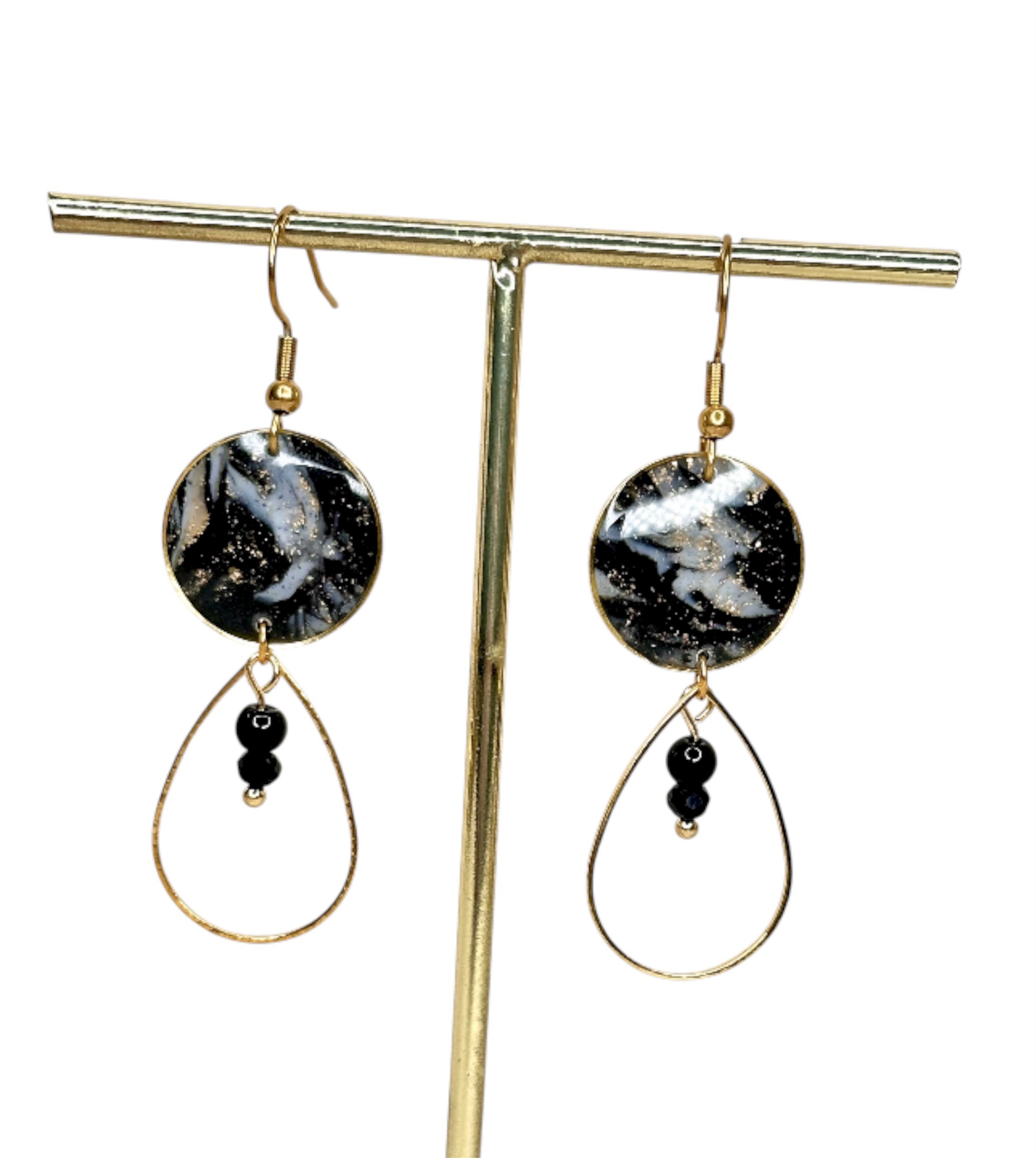 Boucles d’oreilles agate noire & goutte dorée