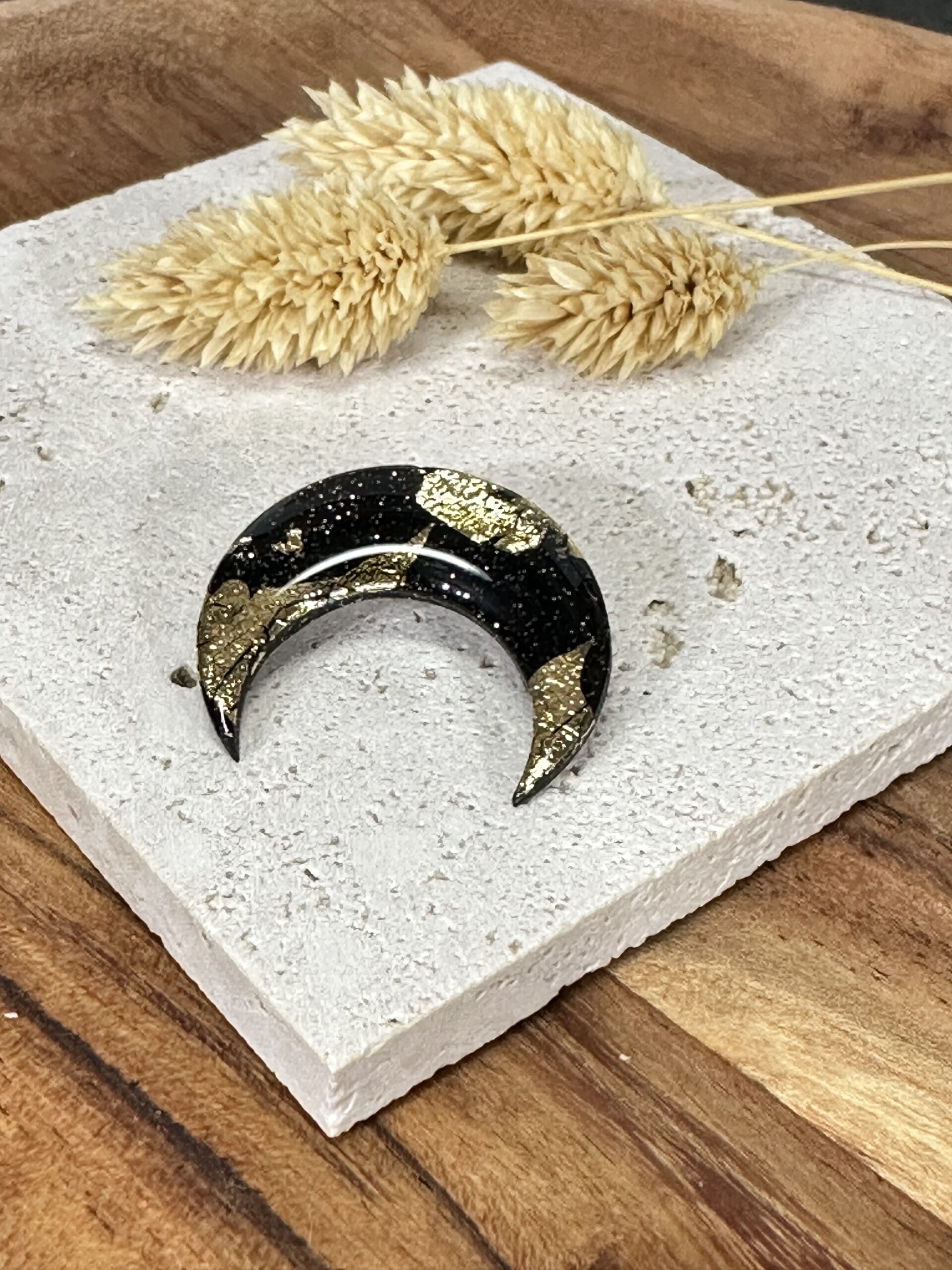 Broche lune noir & feuilles d’or