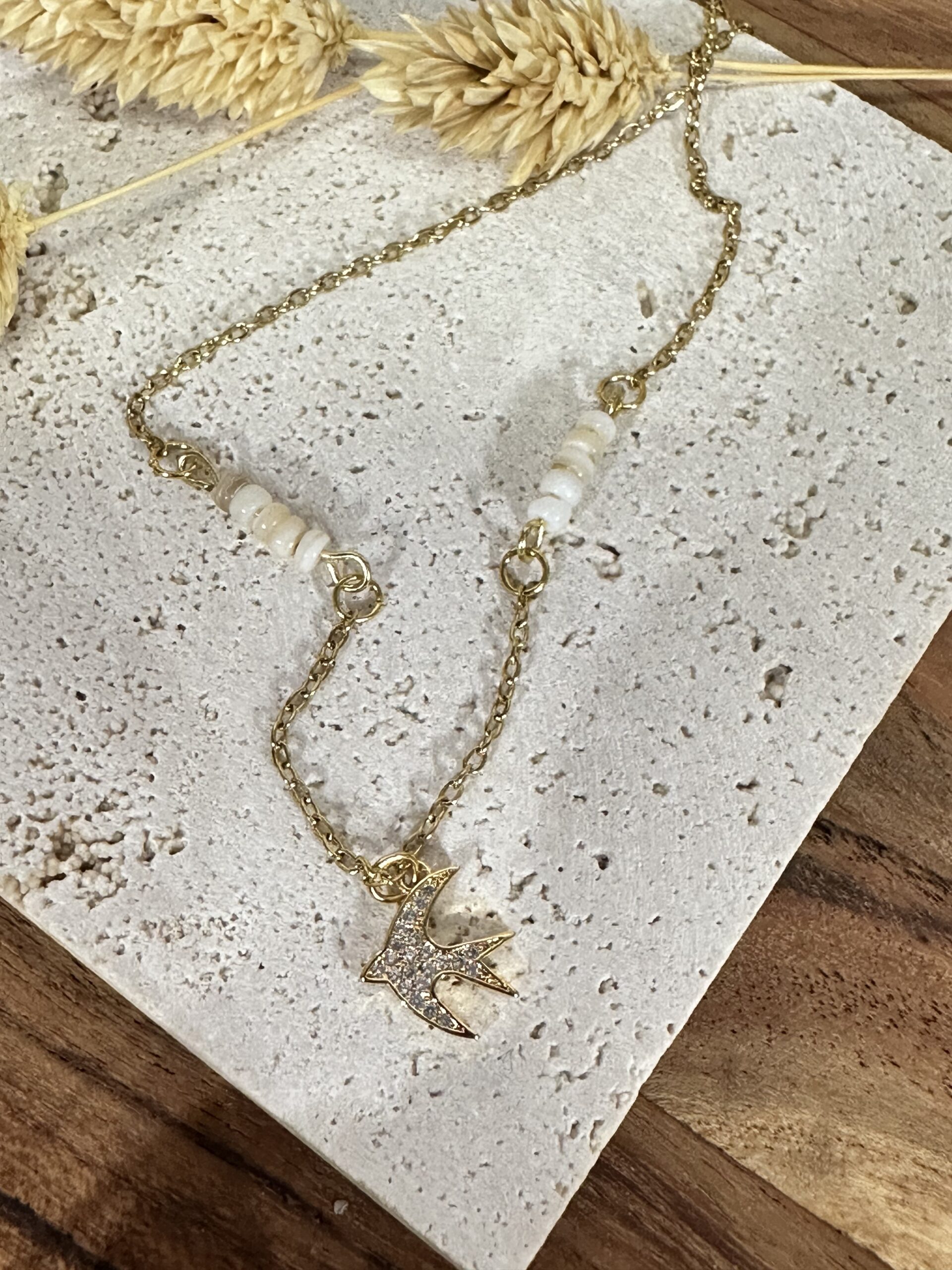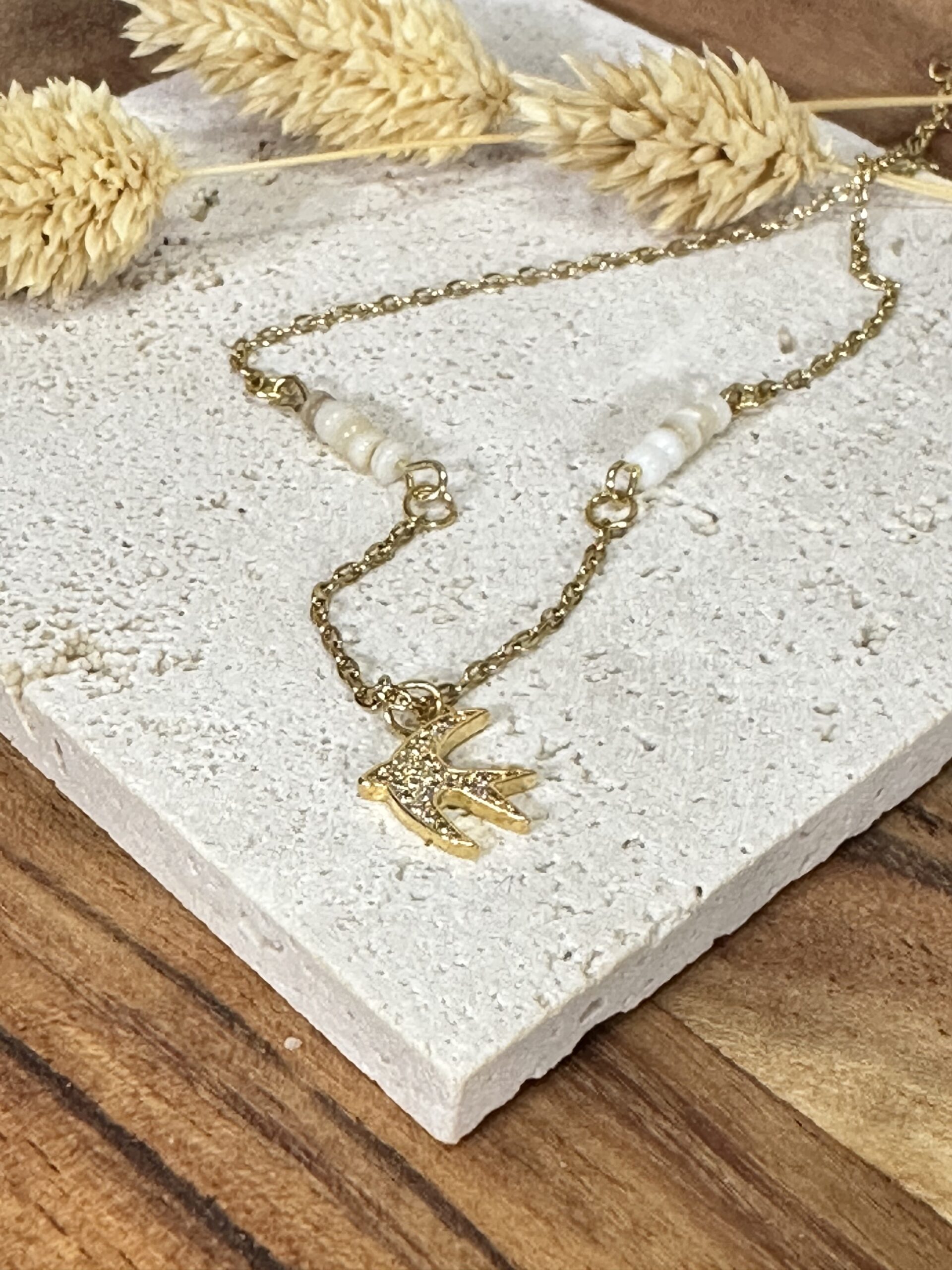 La nacre est choisie pour ces reflets subtils et sa douceur apaisante. Ces perles rajoutent une touche de douceur et de clarté au collier et mettent en valeur l’éclat doré du bijou.